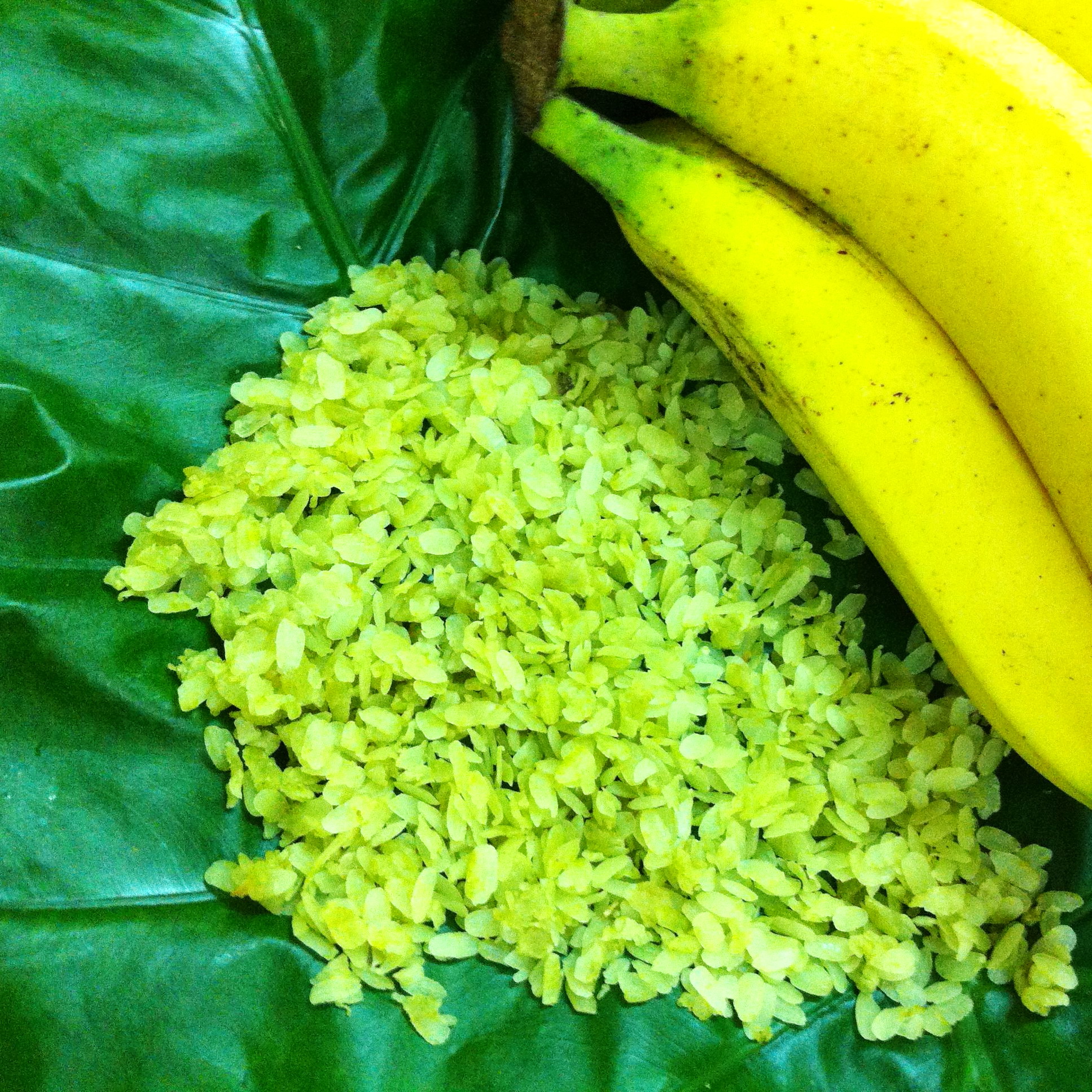 - Gói cốm: Cốm thành phẩm sẽ được gói trong hai lớp lá tươi và buộc bằng lạt thành hình vuông gọn gàng. Lớp trong là lá ráy xanh và mát giữ cho cốm khỏi khô và không phai nhạt màu xanh ngọc; lớp ngoài là lá sen có hương thơm thoang thoảng.